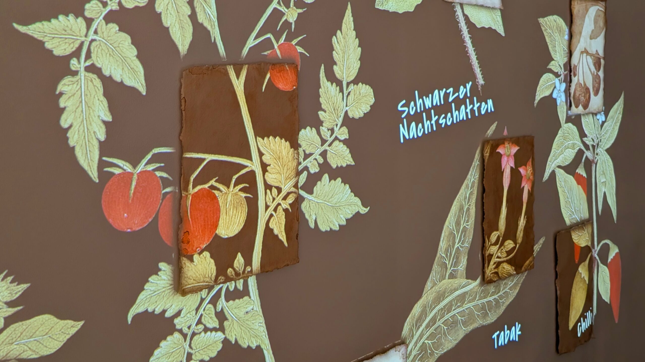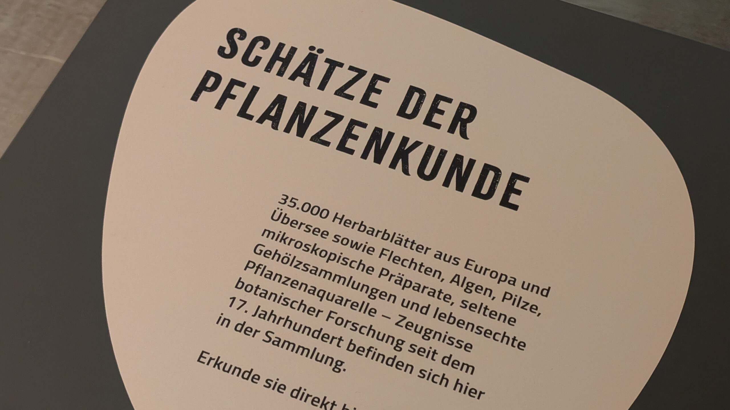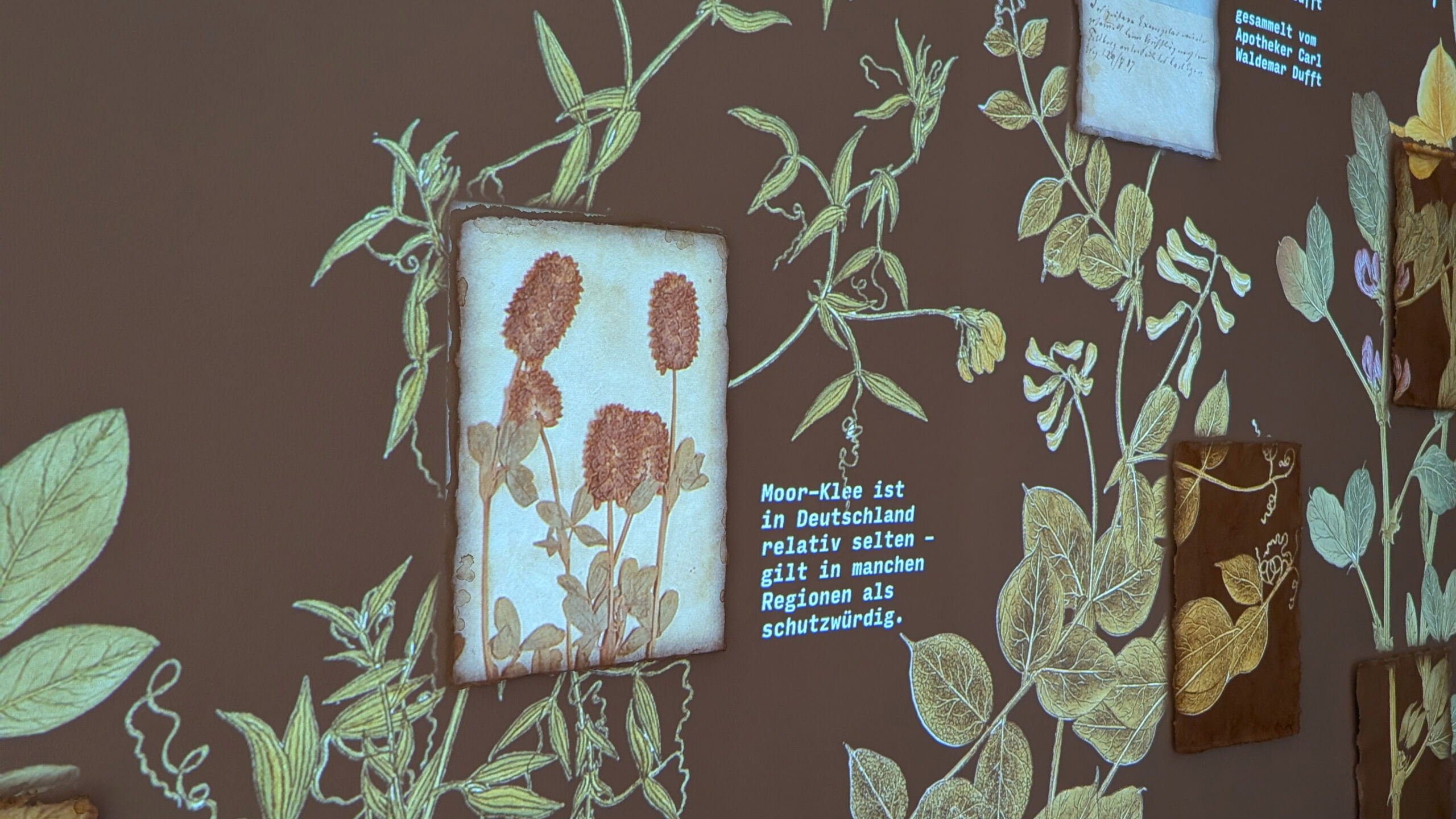 In einem weiteren Raum wird die umfangreiche Sammlung der Herbarbögen präsentiert. Aus Konservatorischen Gründen kann diese nicht im Original gezeigt werden. Also wurde die Präsentation auf ausgewählte, spannende Beispiele reduziert, auf echtes Papier projiziert und durch Animationen kunstvoller Aquarelle zum Leben erweckt.