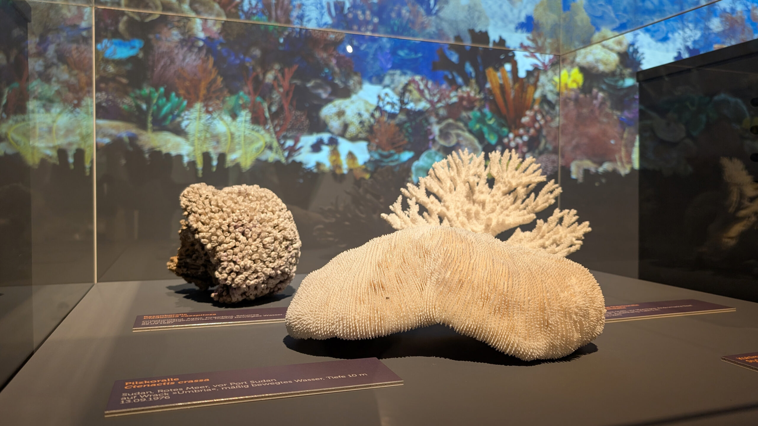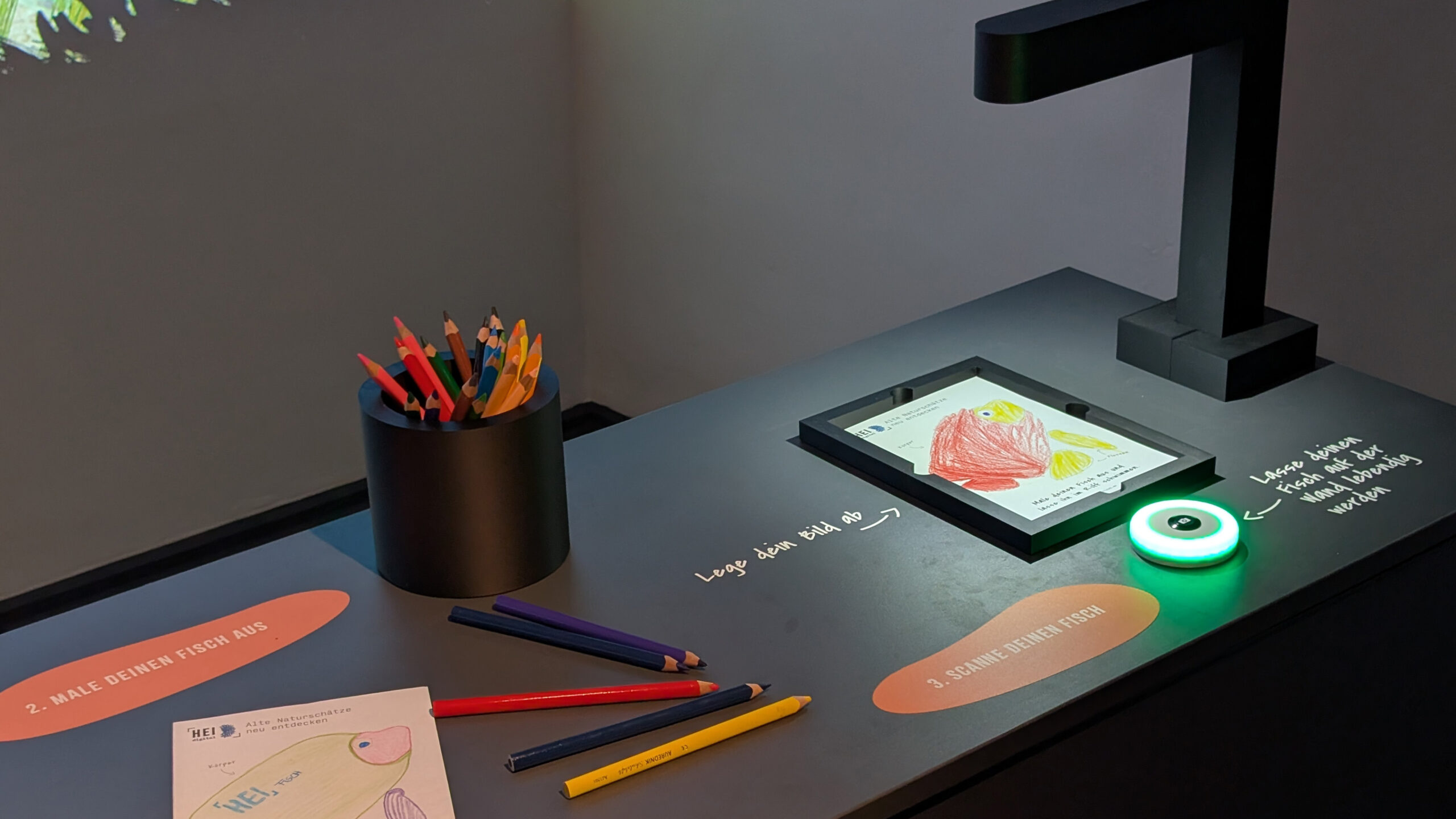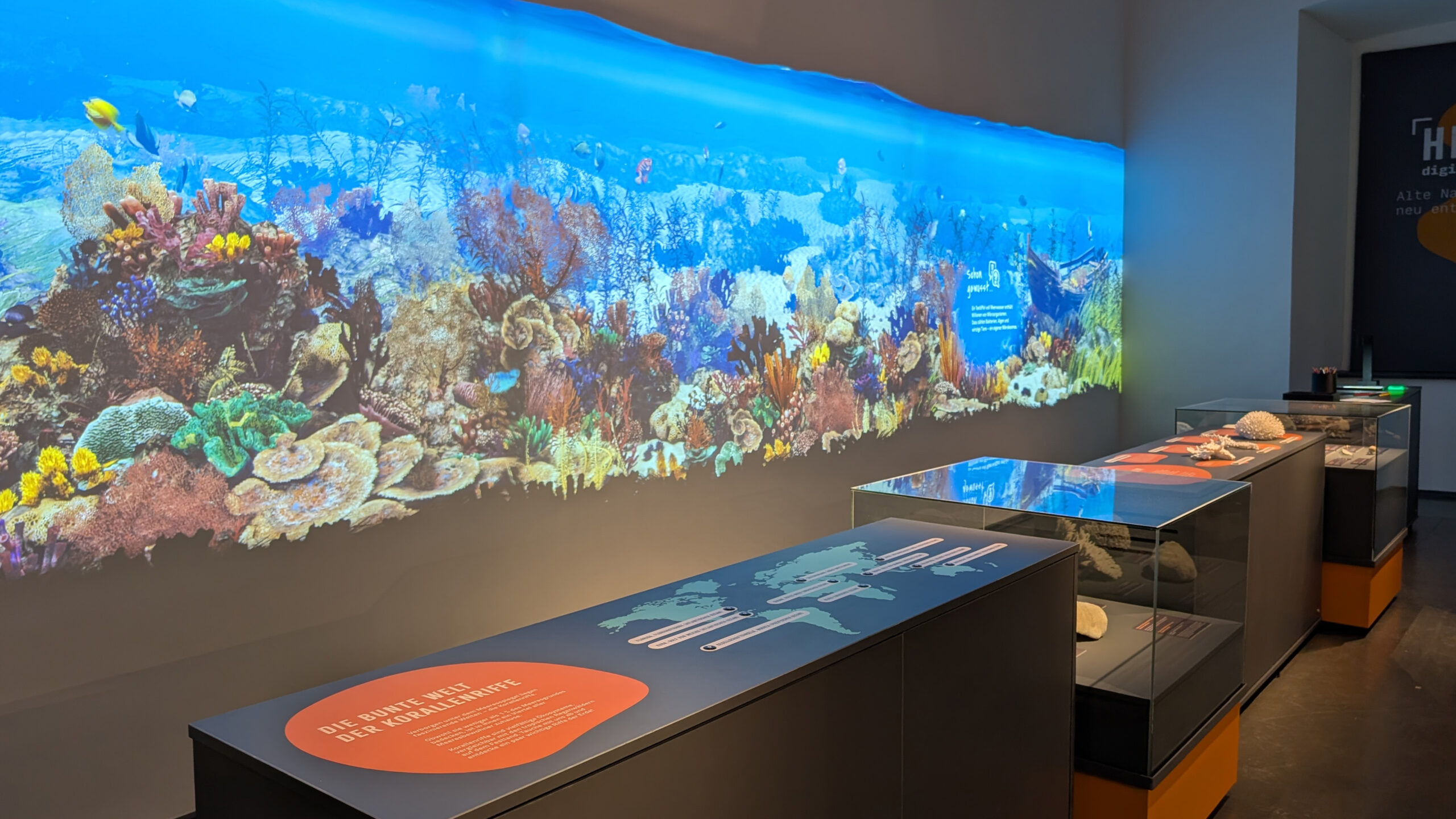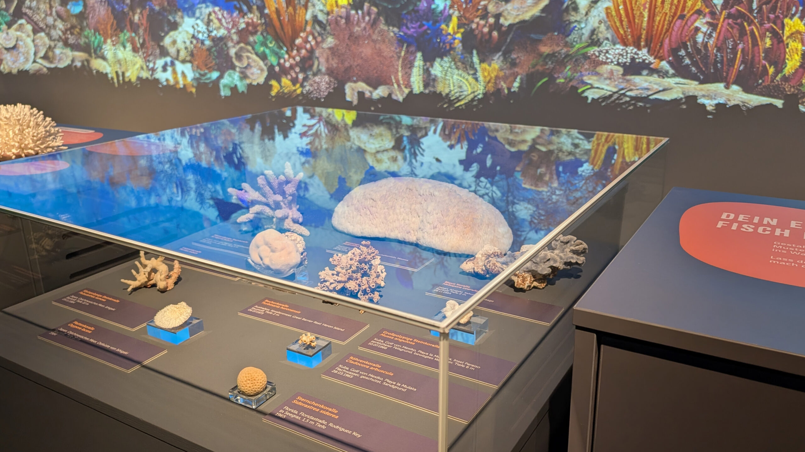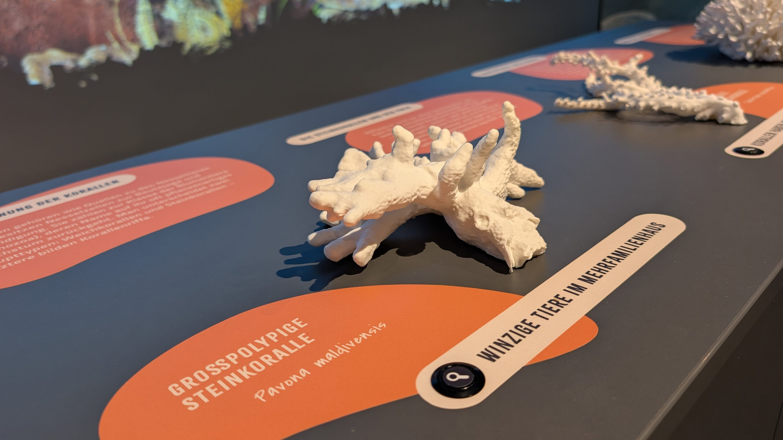 Das Highlight ist ein neun Meter breites digitales Korallenriff, das an verschiedenen Stationen zum Entdecken einlädt. Mit Hilfe einer Game-Engine entwickelt, besitzt das Riff ein eigenes, niemals statisches Leben. Jeder Fisch reagiert individuell auf seine Umgebung, sodass kein Moment dem anderen gleicht. Diese natürliche Dynamik lädt zum Eintauchen ein – und verändert ganz nebenbei den Blick der Besucher:innen. Spielerisch kann man zudem mehr über die Vielfalt der Korallenriffe weltweit erfahren. An einer weiteren Station lässt sich ergründen, was Korallen eigentlich sind und warum sie bedroht sind – unterstützt von 3D-gedruckten Tastmodellen, die das Erlebnis haptisch erfahrbar machen. Für die kleinen (und großen) Besucher:innen gibt es eine kreative Station: Hier dürfen sie einen Fisch analog ausmalen, scannen und damit im digitalen Riff zum Leben erwecken.